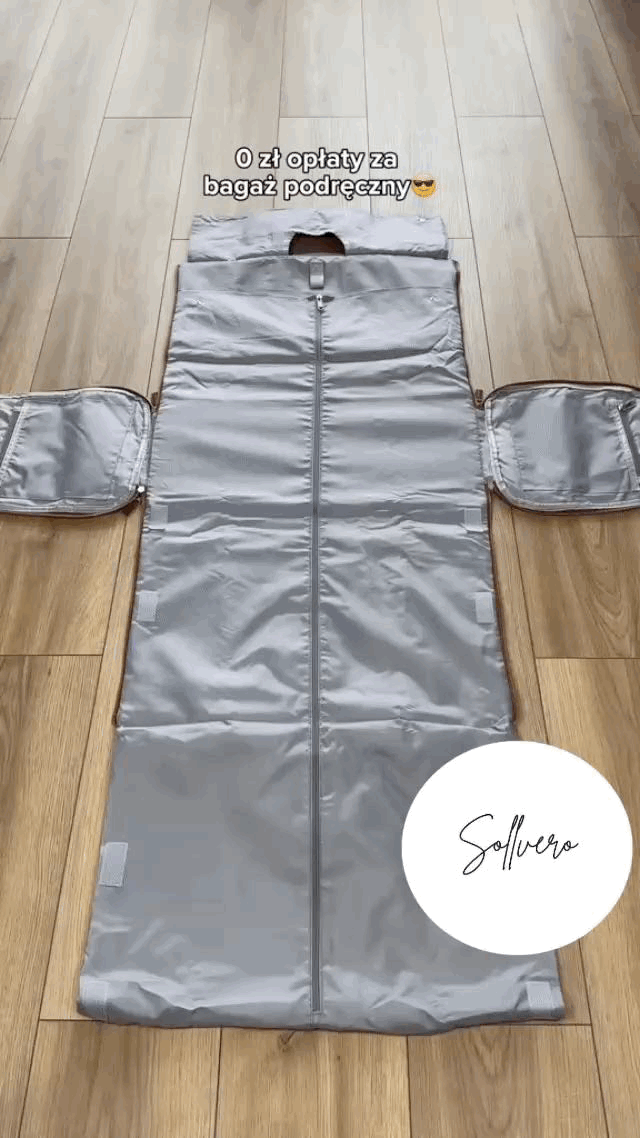 Nie martw się. Specjalny wieszak – w torbie Sollvero™ sprawia, że strój zachowuje fason i przygotowany jest do założenia od razu po wyjęciu. Inteligentne przegródki i specjalna sekcja na odzież wizytową chronią materiał przed zagnieceniami. Po dotarciu na miejsce wystarczy otworzyć torbę, wyjąć gotowy komplet i… już możesz iść na ważne spotkanie czy uroczystość. Pakuj się z Sollvero™ i zawsze wyglądaj perfekcyjnie – bez zbędnego prasowania.